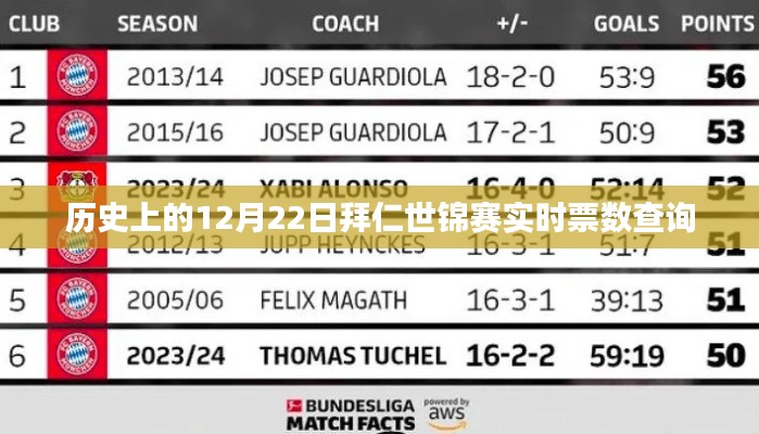 历史上的12月22日,是拜仁世锦赛上值得纪念的日子,在这一天,拜仁以其出色的实力和坚韧不拔的精神,赢得了无数荣誉,对于球迷来说,实时查询拜仁世锦赛的票数情况是非常重要的,希望本文能够为您提供有关拜仁世锦赛票数查询的详细信息,让您更好地了解这一天的历史背景以及实时查询票数的方法。